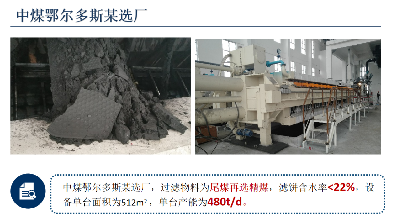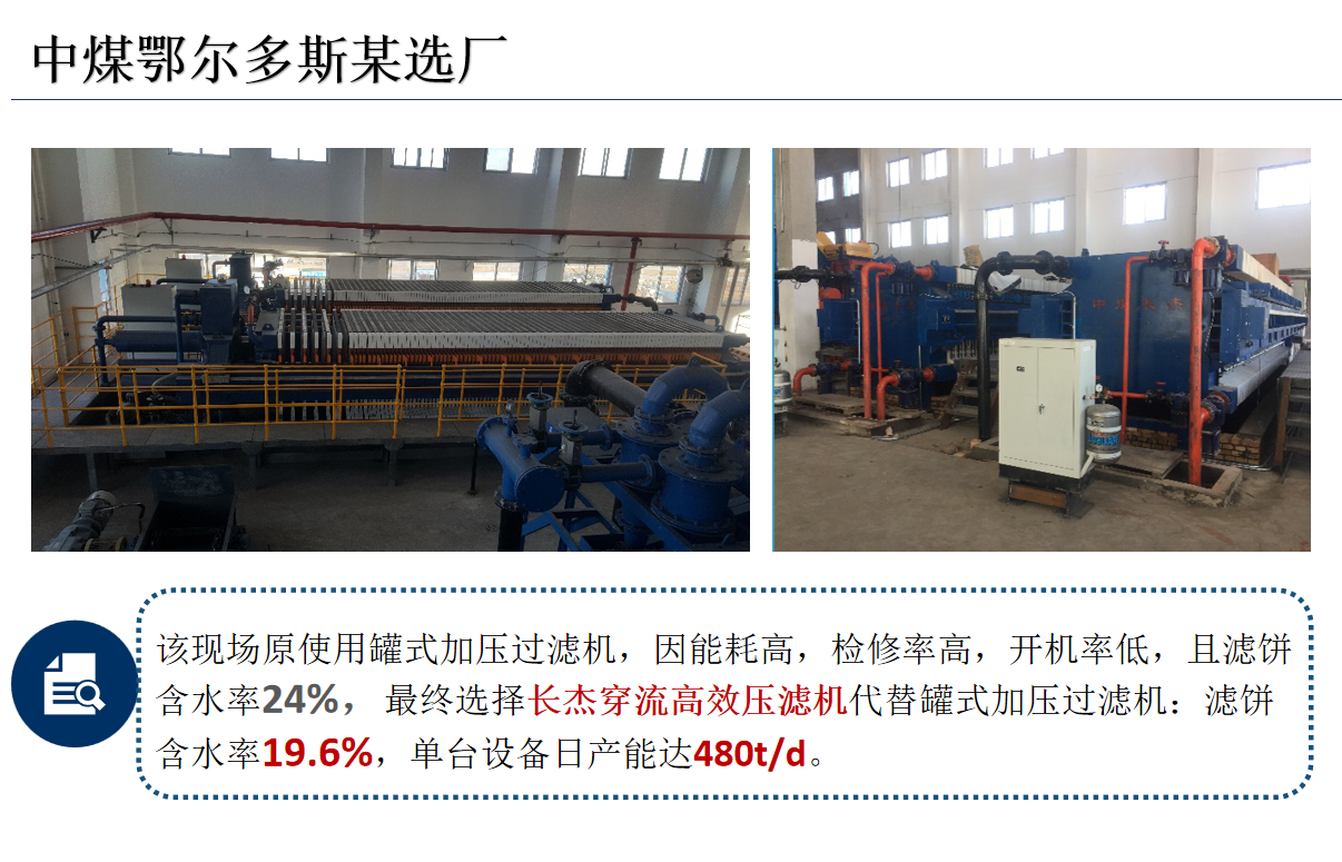 3、针对罐式加压过滤:建议直接替换,更换为全新长杰穿流高效隔膜压滤机设备,基本实现精煤水分12-15%,热值提升500-1100大卡,能耗至少减少20%,吨运行成本低于3元。